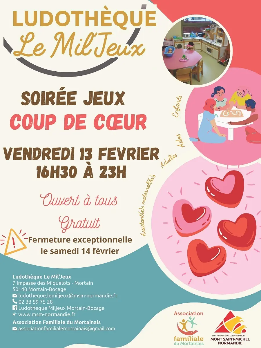 La ludothèque, Le Mil’Jeux, organise sa prochaine soirée jeux. Gratuite et ouverte à tous, cette soirée sera l’occasion de découvrir une sélection de jeux et de jouets « coup de cœur ». Seul, en famille ou entre amis, chacun est invité à venir partager un moment convivial et ludique.